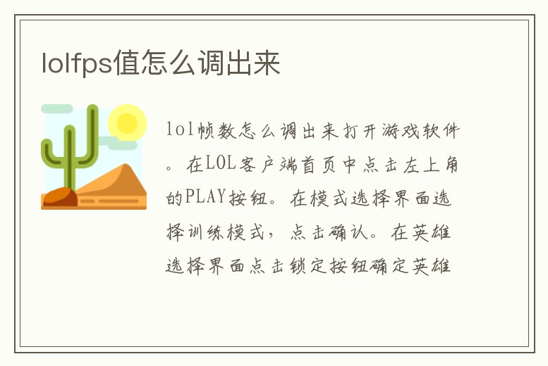 lol幀數怎么調出來打開游戲軟件。在LOL客戶端首頁中點擊左上角的PLAY按鈕。在模式選擇界面選擇訓練模式,點擊確認。在英雄選擇界面點擊鎖定按鈕確定英雄。在游戲對局中按下鍵盤上的ctrl+F打開幀率即可。1、LOL怎么把FPS顯示打開在游戲中直接按快捷鍵按CTRL+F即可打開和關閉FPS和PING。可以按ESC進入設置——熱鍵