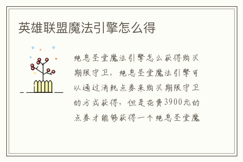 購買期限守衛(wèi)。絕息圣堂魔法引擎可以通過消耗點券來購買期限守衛(wèi)的方式獲得,但是花費3900元的點券才能夠獲得一個絕息圣堂魔法引擎,獲得概率非常低。絕息圣堂魔法引擎是游戲《英雄聯盟》當中的道具,《英雄聯盟》是由騰訊控股的。