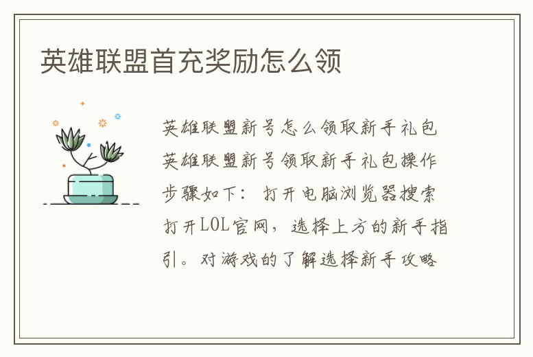 英雄聯盟新號領取新手禮包操作步驟如下:打開電腦瀏覽器搜索打開LOL官網,選擇上方的新手指引。對游戲的了解選擇新手攻略,領取新手禮包需要點擊選擇活動成長菜單。點擊下方頁面的領取新手禮包選項,根據提示綁定游戲賬號。