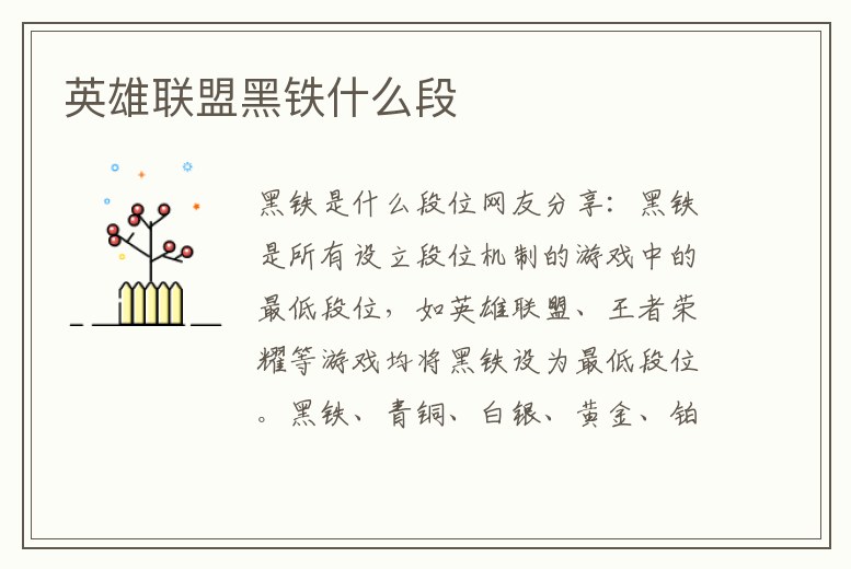 是在英勇青銅之下的段位,是英雄聯盟最低的段位。由于黑鐵段位是最低的段位,低分段玩家可以在該段位中獲得更好的認可。其他段位:英勇黃銅、不屈白銀、榮耀黃金、華貴鉑金、璀璨鉆石、超凡大師、傲世宗師、最強王者。