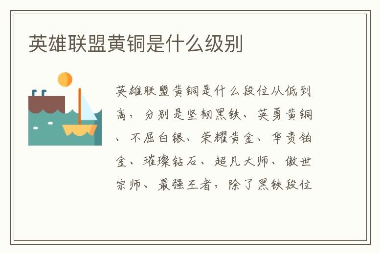 黃銅是指英雄聯(lián)盟排位中的一個段位。英雄聯(lián)盟設置了七個不同的段位分別是:黃銅、白銀、黃金、鉑金、鉆石、大師、王者。黃銅是屬于最低等的段位,基本上新手都集中在這個段位。
