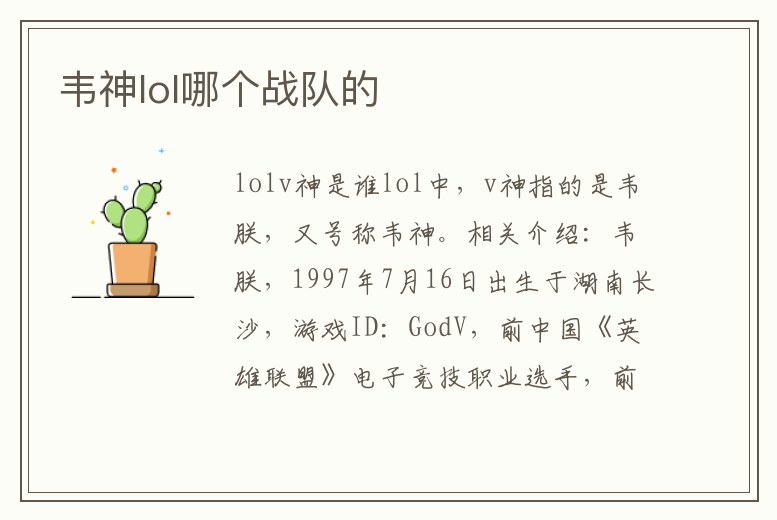 韋神原名叫韋朕,1997年7月16日出生于湖南長沙,游戲ID:GodV,前中國《英雄聯盟》電子競技職業選手,前LGD戰隊中單,現《絕地求生》職業選手,4AM戰隊自由人。韋神介紹韋朕,1997年7月16日出生于湖南長沙,游戲ID:GodV,前。