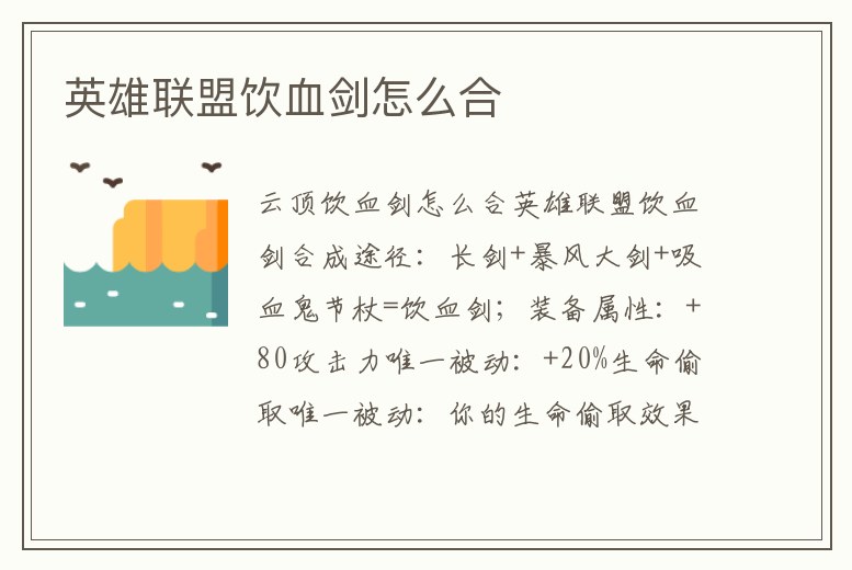 網友分享:飲血劍合成所需:暴風之劍(1300金幣)+長劍(350金幣)+吸血鬼節杖(900金幣)+950金幣→飲血劍(3500金幣)物品屬性:+80攻擊力 唯一被動:+20%生命偷取 唯一被動:你的生命偷取效果可以對你進行過量治療。溢出的生。