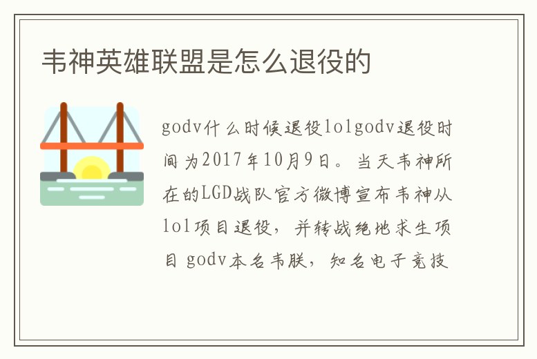 godv退役時間為2017年10月9日。當天韋神所在的LGD戰隊官方微博宣布韋神從lol項目退役,并轉戰絕地求生項目 godv本名韋朕,知名電子競技職業選手,前英雄聯盟。曾經的lpl第一皎月、第一亞索、第一冰女、第一發條。曾經的lpl第。