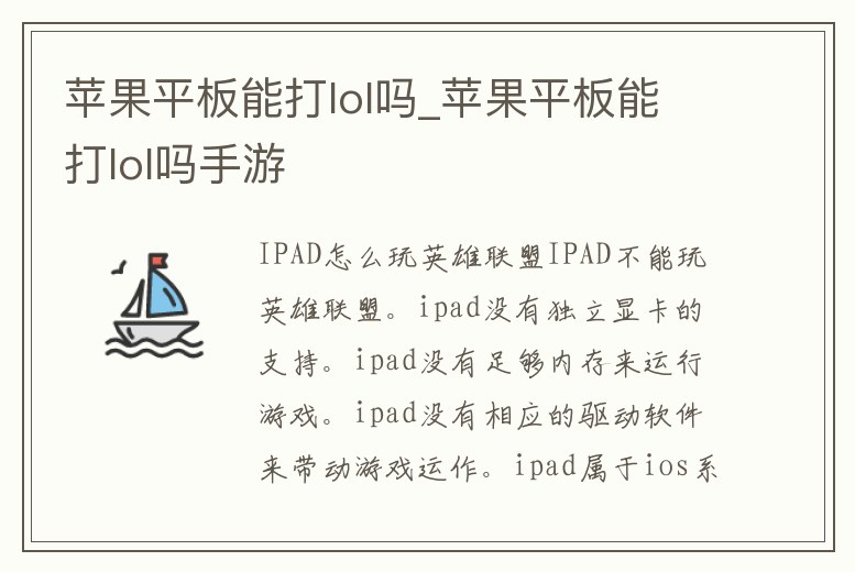 IPAD不能玩英雄聯盟。ipad沒有獨立顯卡的支持。ipad沒有足夠內存來運行游戲。ipad沒有相應的驅動軟件來帶動游戲運作。ipad屬于ios系統,英雄聯盟目前只開發PC平臺,暫時不兼容ios平臺。ipad上有一種叫splashto。