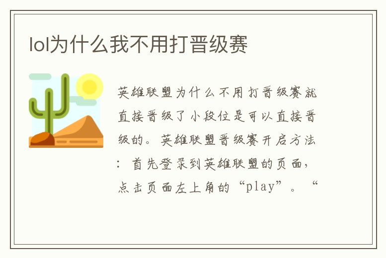 英雄聯盟為什么不用打晉級賽就直接晉級了小段位是可以直接晉級的。英雄聯盟晉級賽開啟方法:首先登錄到英雄聯盟的頁面,點擊頁面左上角的“play”?!皃lay”的頁面,選擇“召喚獸峽谷5V5”模式,排位都是玩這個模式的,再選擇你要玩的排位類型,是單雙排位還。1、LOL戰隊排位白銀1到黃金5不需要打晉級賽了嗎網友分享:正常情況都是需要打晉級賽的,跳段都是在都階層間,大段位是