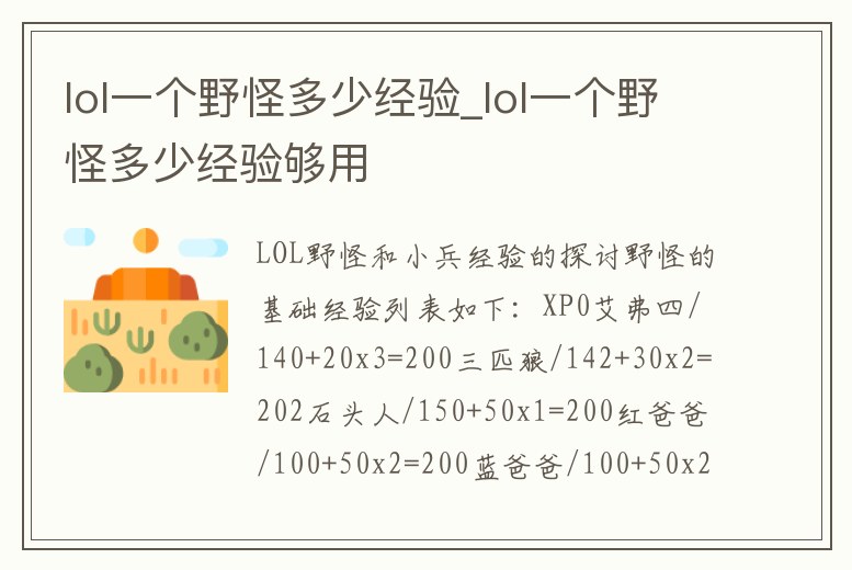 小兵 如果附近沒有隊友 那么經驗獨得是 35到60野怪 分為大型野怪和小型 經驗隨著游戲時間而提升 比如打一只蛤蟆 單人游戲開始10分鐘內擊殺 大概有130經驗 足夠 1級升2級 而擊殺的這個過程中 附近有隊友的話經驗將按。
