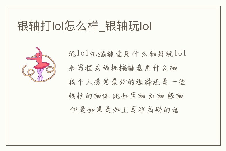 玩lol和寫程式碼機械鍵盤用什么軸 我個人感覺最好的選擇還是一些線性的軸體 比如黑軸 紅軸 銀軸 但是如果是加上寫程式碼的話 我覺得黑軸的力度還是有點大了 時間長的話可能會疲勞 所以后兩個比較不錯 然后這兩個要是。