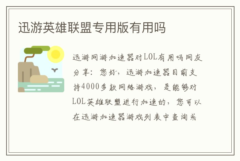 有用,對于英雄聯盟這類3D競技場戰網游戲來說,在速度方面對玩家的要求非常苛刻,以前不用迅游加速器的時候網速真是太坑爹了,根本沒法玩,因為網速太卡,在游戲里也被人鄙視。后來我在朋友的推薦下使用了迅游加速器,效果真。