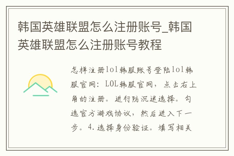 網友分享:進入韓服英雄聯盟官方,勾選官方游戲協議,選擇身份驗證。然后輸入賬號提交后等待審核即可。具體步驟如下:登陸lol韓服官網:英雄聯盟韓服官網,點擊右上角注冊。勾選官方游戲協議,然后進入下一步。選擇身份驗證。