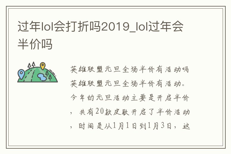 英雄聯盟元旦全場半價有活動。今年的元旦活動主要是開啟半價,共有20款皮膚開啟了半價活動,時間是從1月1日到1月3日,這20款皮膚也是當前的熱門皮膚,其中包括未來戰士系列,玉劍系列,源計劃系列。英雄聯盟介紹 英雄聯盟League。