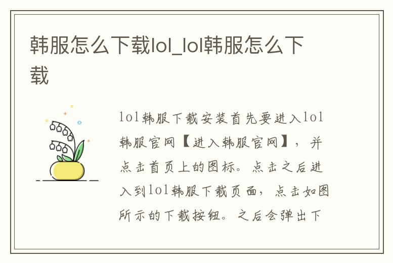 方法/步驟 首先,百度搜索韓服lol官網,然后會出現如下圖所示的頁面。然后點擊進入韓服lol的官網,接下來就是下載了。如圖所示。點擊官網正中央最大的一顆按鈕就是下載頁面了。在下載頁面也只有一顆按鈕,點擊圖片所示的地方。