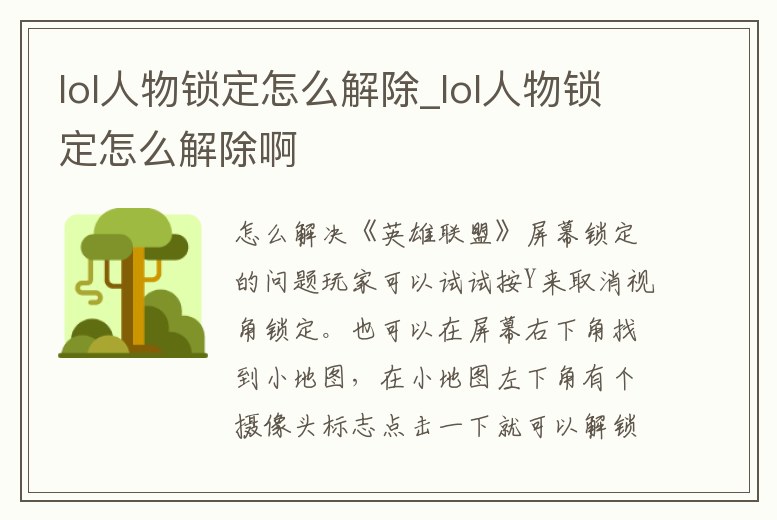 怎么解決《英雄聯(lián)盟》屏幕鎖定的問(wèn)題玩家可以試試按Y來(lái)取消視角鎖定。也可以在屏幕右下角找到小地圖,在小地圖左下角有個(gè)攝像頭標(biāo)志點(diǎn)擊一下就可以解鎖了。還可以把鼠標(biāo)移到小地圖上,拖動(dòng)小地圖的白色框,再移動(dòng)英雄就會(huì)解除鎖定了。英雄聯(lián)盟由美。1、LOL鎖屏怎么了辦網(wǎng)友分享:按“Y”來(lái)取消視角鎖定——如果“Y”