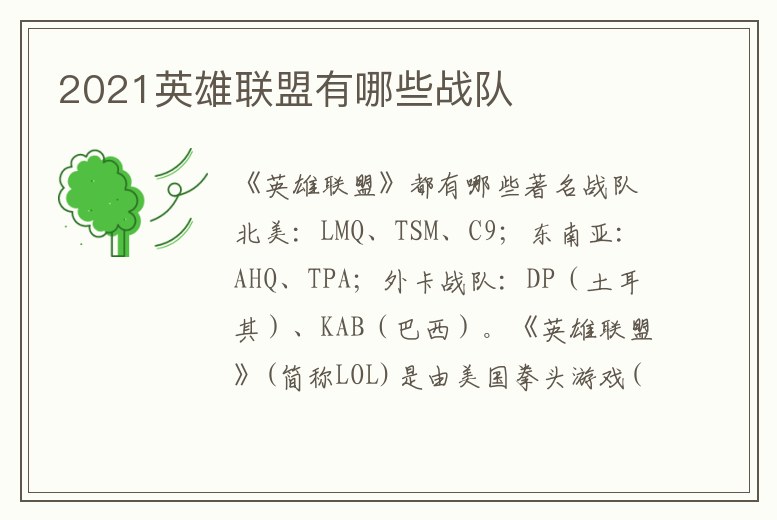 《英雄聯盟》都有哪些著名戰隊北美:LMQ、TSM、C9;東南亞:AHQ、TPA;外卡戰隊:DP(土耳其)、KAB(巴西)。《英雄聯盟》(簡稱LOL)是由美國拳頭游戲(RiotGames)開發、中國大陸地區騰訊游戲代理運營的英雄對戰DOTA類競技網游。游戲里擁有數百個個性英雄。1、lol全華班現在有幾支隊伍全中文班的lo