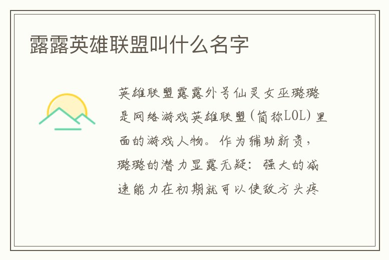 英文名叫lulu所以國服就直譯了、6300英雄,輔助類,比較全面的輔助英雄(有護盾,有加速,和大招的變大效果,沒有加血),對敵有變形,有減速,前期對線優勢明顯,CC能力不差。可以打上單和ADC,因為攻擊動畫原因如果攻速。