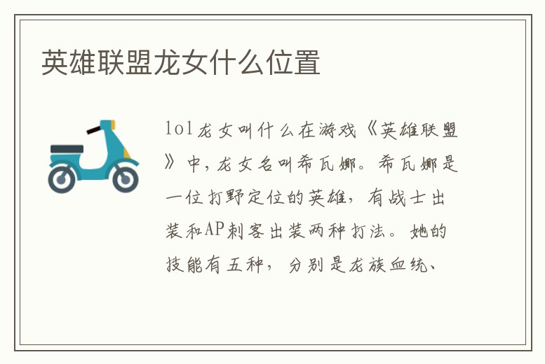 在游戲《英雄聯(lián)盟》中,龍女名叫希瓦娜。希瓦娜是一位打野定位的英雄,有戰(zhàn)士出裝和AP刺客出裝兩種打法。她的技能有五種,分別是龍族血統(tǒng)、龍牙突刺、烈火燎原、烈焰吐息和魔龍降世。LOL龍血武姬希瓦娜背景故事:在符文之地。