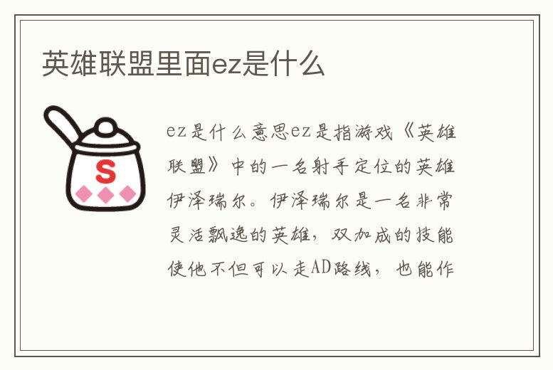 ez是指游戲《英雄聯盟》中的一名射手定位的英雄伊澤瑞爾。伊澤瑞爾是一名非常靈活飄逸的英雄,雙加成的技能使他不但可以走AD路線,也能作為法師走AP路線。伊澤瑞爾的任何技能在擊中目標后,都會提升他的攻擊速度,最多可疊加5。