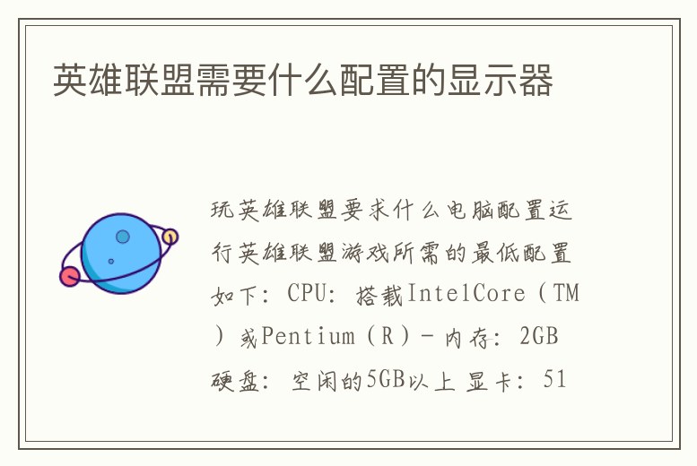 Lol英雄聯盟最低電腦配置要求: 英雄聯盟最低電腦配置要求 配件名稱 最低配置要求 推薦電腦配置 處理器 P4 2.0G P4 3.0G 顯示卡 128M視訊記憶體 Geforce 8600GT或同級顯示卡以上 記憶體 1GB 2GB 硬碟 5GB以上 10GB以上 Direct版本 D。