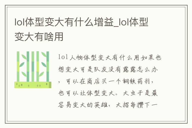就會獲得一個增益效果,生命值增加百分之十,體積變大。某些英雄的技能可以使其他英雄變大,如仙靈女巫的R技能可以使其他英雄的體型變大。某些消耗品可以使英雄變大,如鋼鐵合劑可以使英雄體型增大百分之二十五。