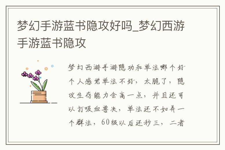 個人感覺單法不好,太脆了,隱攻生存能力會高一點,并且還可以打吸血獸決,單法還不如弄一個群法,60級以后還秒三,二者價格只差了一本大法術,其他書都是一樣的 。