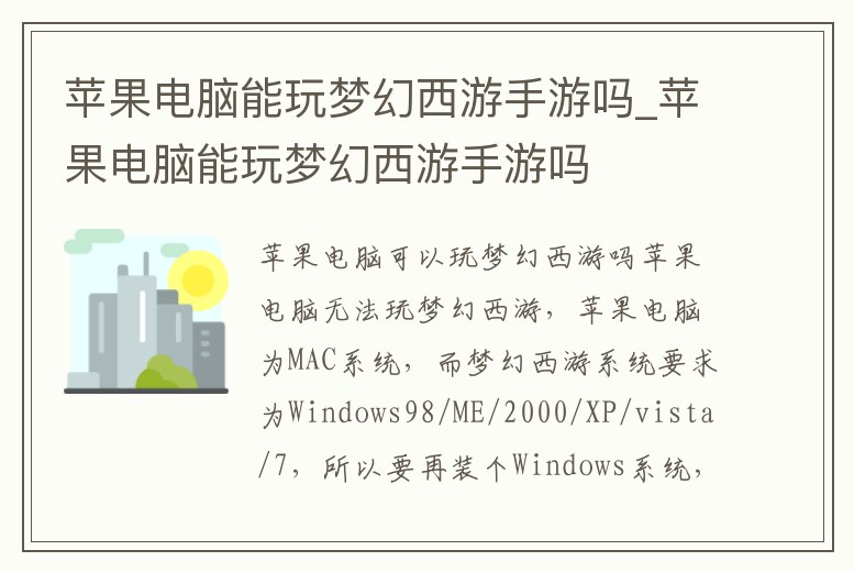蘋果電腦無法玩夢幻西游,蘋果電腦為MAC系統,而夢幻西游系統要求為Windows98/ME/2000/XP/vista/7,所以要再裝個Windows系統,就可以玩了。其具體配置要求如下:一、最低配置要求:操作系統:Windows98/ME/2000/XP/vista/7。