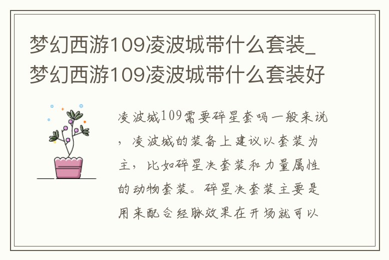 凌波城109需要碎星套嗎一般來說,凌波城的裝備上建議以套裝為主,比如碎星決套裝和力量屬性的動物套裝。碎星決套裝主要是用來配合經脈效果在開場就可以額外獲得一點戰意,在提升自己物理傷害結果的同時還可根據情況使用天崩地裂或翻江倒海。1、夢幻西游109凌波城帶漫天套好嗎而且裝備多是點化的碎星訣套,有回合限制,所以除了暴力三