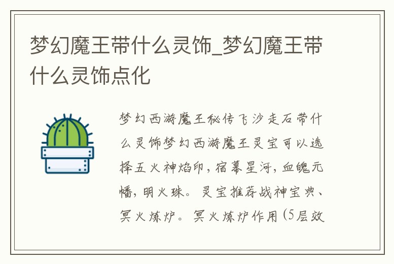 夢幻西游魔王靈寶可以選擇五火神焰印,宿幕星河,血魄元幡,明火珠。靈寶推薦戰(zhàn)神寶典、冥火煉爐。冥火煉爐作用(5層效果):消耗1/3/7個靈元,令目標(biāo)每回合開始時受到(施法者等級*2/5/10)點氣血流失,持續(xù)到戰(zhàn)斗結(jié)束。