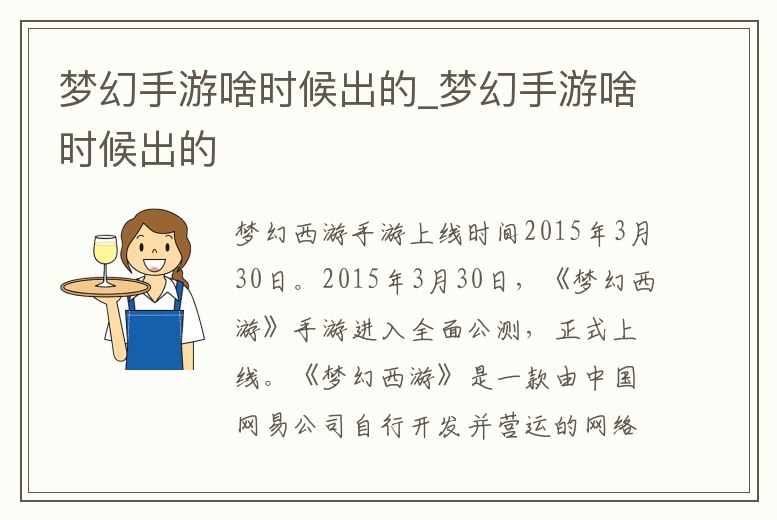2015年3月30日。2015年3月30日,《夢幻西游》手游進入全面公測,正式上線?!秹艋梦饔巍肥且豢钣芍袊W易公司自行開發并營運的網絡游戲。