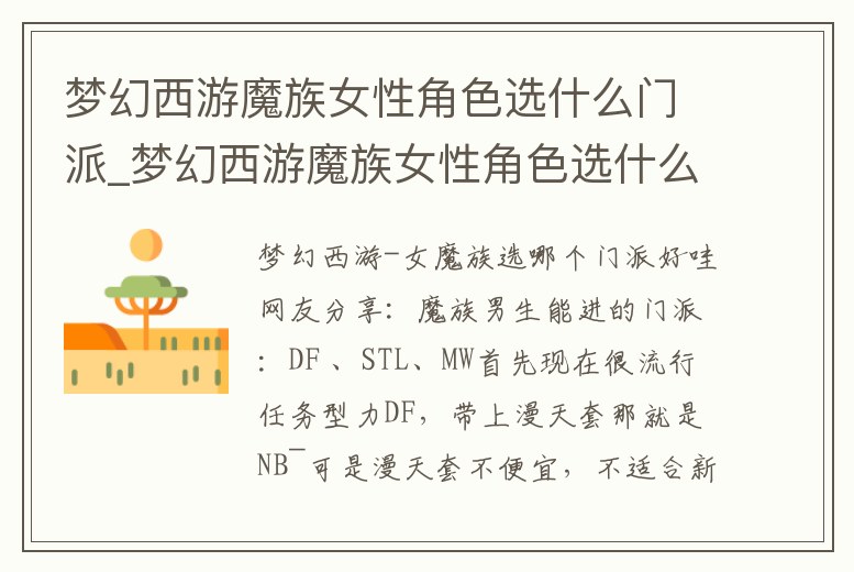 其實魔族的門派都是不錯的。女魔來說,可以拜MW,DF和PS。我說明一下吧 每個門派都有自己的特色,要看你喜歡哪個類型的咯。MW呢,就可以說是血法型的吧,這個門派沒有封,有秒5的飛沙,單秒的三昧 魔王就是法攻最。