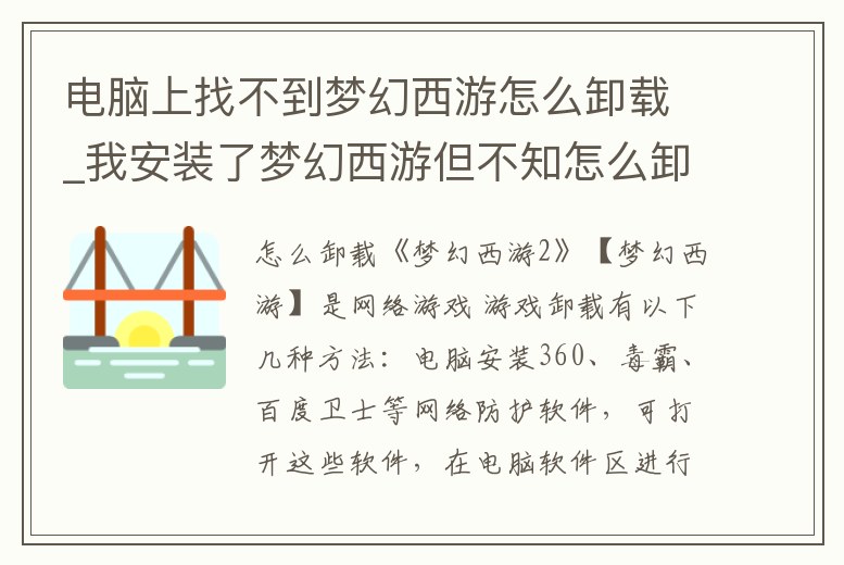 【夢幻西游】是網絡游戲 游戲卸載有以下幾種方法:電腦安裝360、毒霸、百度衛士等網絡防護軟件,可打開這些軟件,在電腦軟件區進行卸載。電腦左下角開始鍵,查看所有程序,找到目標軟件下拉卸載軟件。如果以上方法不能。