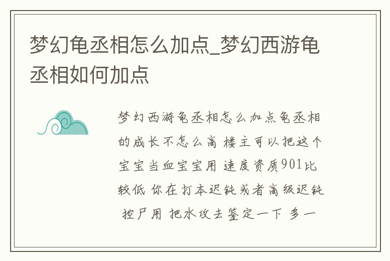 夢幻龜丞相怎么加點_夢幻西游龜丞相如何加點