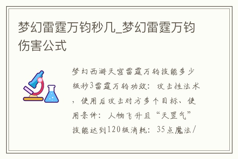 人物飛升且“天罡氣”技能達到120級就可以秒3了.雷霆萬鈞 功效:攻擊性法術,使用后攻擊對方多個目標 使用條件:人物飛升且“天罡氣”技能達到120級 消耗:35點魔法/人 。