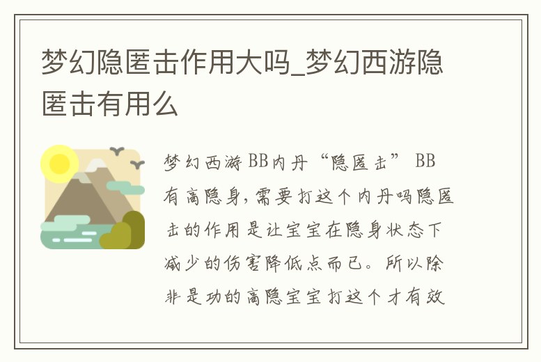 隱匿擊的作用是讓寶寶在隱身狀態下減少的傷害降低點而已。所以除非是功的高隱寶寶打這個才有效果。如果血的話 就沒必要了 還不如打騰挪勁之類的防御類內丹。