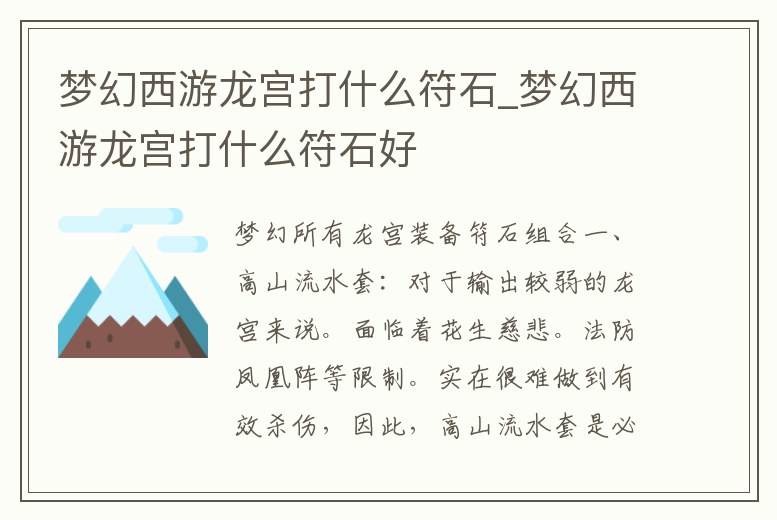 一、高山流水套:對于輸出較弱的龍宮來說。面臨著花生慈悲。法防鳳凰陣等限制。實在很難做到有效殺傷,因此,高山流水套是必不可少的一套符石組合,推薦位置:腰帶 效果: 對召喚獸增加人物等級/3+30的法術傷害 符石組合:。