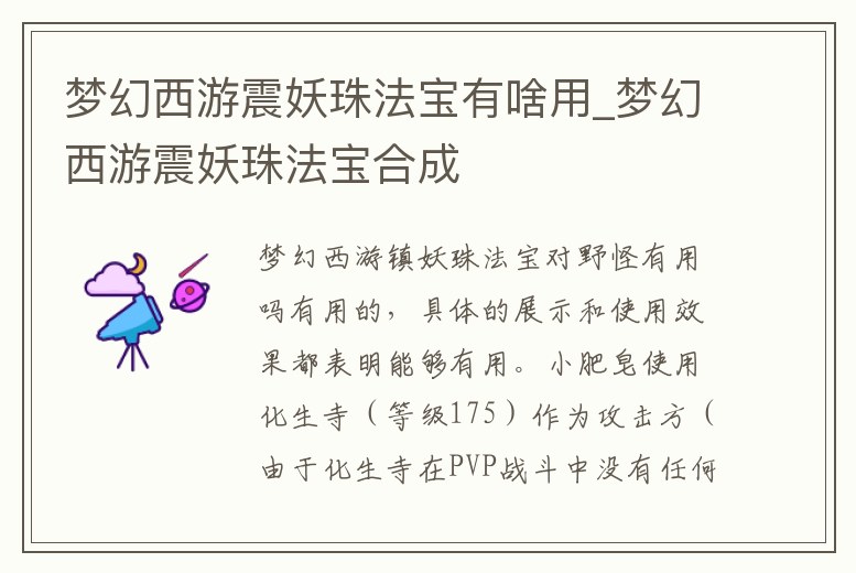 有用。鎮妖珠對任務有用,新增二級被動法寶鎮妖珠,增加召喚獸的法術攻擊,這個對任務玩家來說有點用,帶須彌寶寶的話可以佩戴,PK的話就雞肋了,因為可佩戴的格子有限,一般不會選擇此類型的法寶。《夢幻西游》是一款由中。