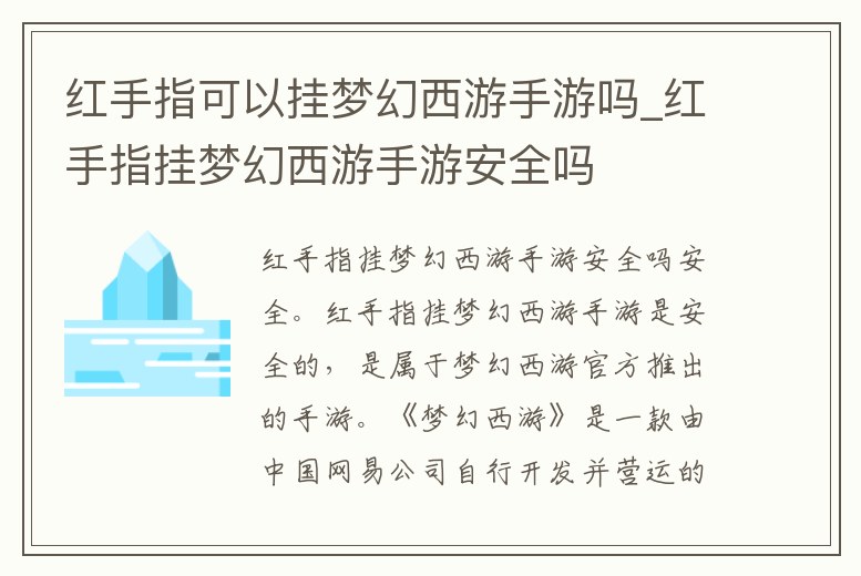 安全。紅手指掛夢幻西游手游是安全的,是屬于夢幻西游官方推出的手游?!秹艋梦饔巍肥且豢钣芍袊W(wǎng)易公司自行開發(fā)并營運的網(wǎng)絡(luò)國產(chǎn)游戲。游戲以著名的章回小說《西游記》故事為背景,透過Q版的人物,試圖營造出浪漫的網(wǎng)絡(luò)游戲風(fēng)格。
