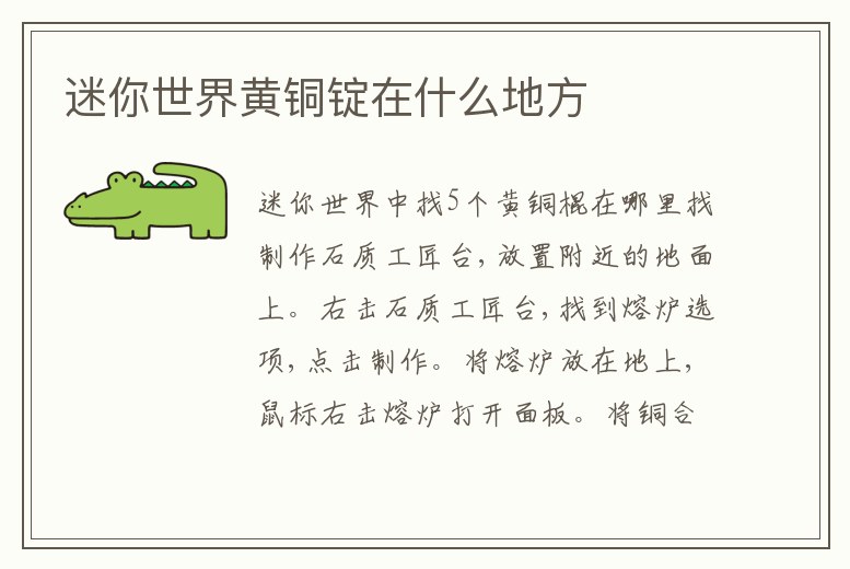 制作石質工匠臺,放置附近的地面上。右擊石質工匠臺,找到熔爐選項,點擊制作。將熔爐放在地上,鼠標右擊熔爐打開面板。將銅合金礦石放入熔爐,添加燃料煅燒。熔爐將銅合金礦石冶煉成黃銅錠,采集即可。迷你世界。