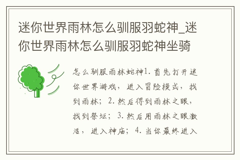 迷你世界雨林怎么馴服羽蛇神_迷你世界雨林怎么馴服羽蛇神坐騎
