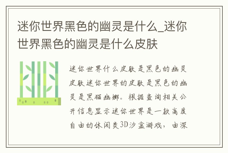 迷你世界的皮膚是黑色的幽靈是黑貓幽娜。根據查詢相關公開信息顯示迷你世界是一款高度自由的休閑類3D沙盒游戲,由深圳市迷你玩科技有限公司運營。這是國產沙盒游戲,通過玩家破壞方塊與創造方塊來組合成屬于自己的建筑以及與小伙伴。