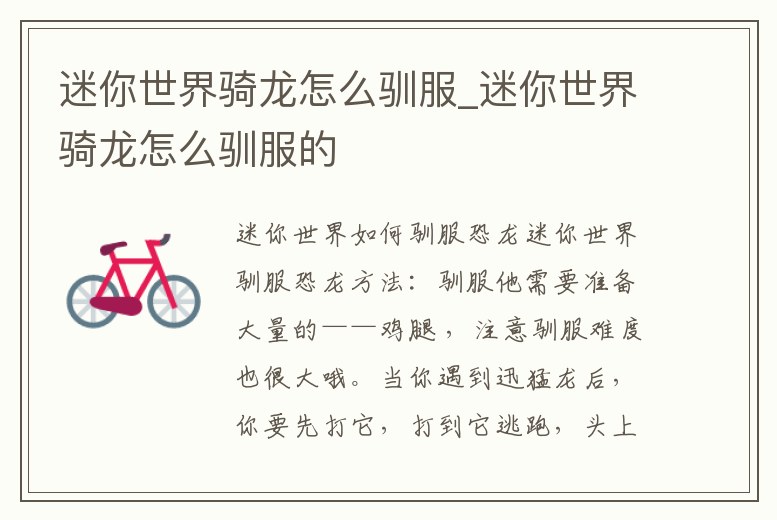 迷你世界馴服恐龍方法:馴服他需要準備大量的——雞腿 ,注意馴服難度也很大哦。當你遇到迅猛龍后,你要先打它,打到它逃跑,頭上會出現一個哭的圖標。這時候你就要用烤雞來喂它,有幾率成功馴服。如果失敗,它有可能又會。