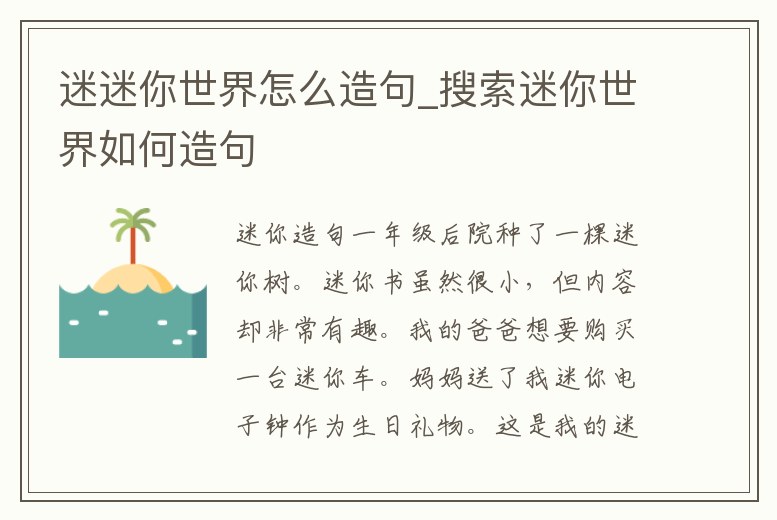 后院種了一棵迷你樹。迷你書雖然很小,但內容卻非常有趣。我的爸爸想要購買一臺迷你車。媽媽送了我迷你電子鐘作為生日禮物。這是我的迷你造句車。這里有一個迷你臺球桌。爺爺在后院種了很多迷你。