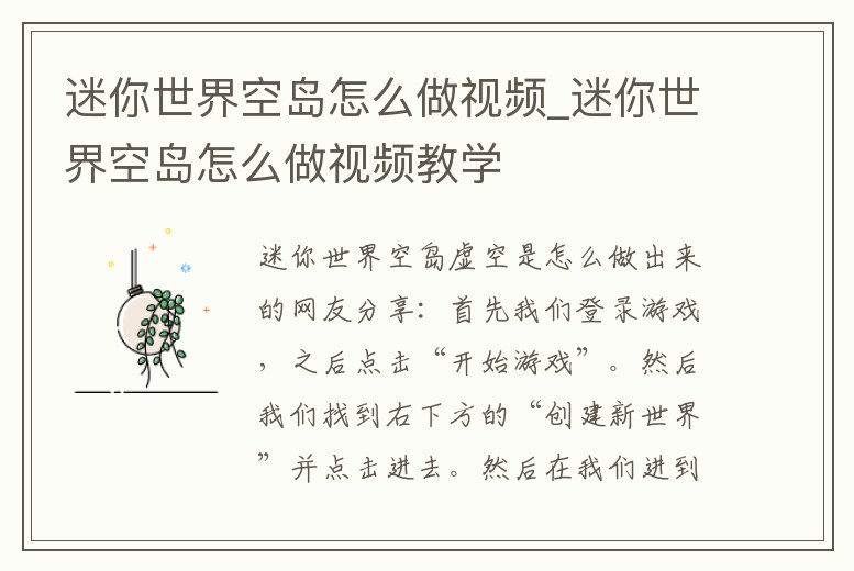 迷你世界空島怎么做視頻_迷你世界空島怎么做視頻教學