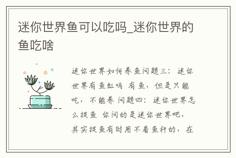 問題三:迷你世界有魚缸嗎 有魚,但是只能吃,不能養 問題四:迷你世界怎么捉魚 你問的是迷你世界吧,其實捉魚有時用不著魚桿的,在雪地環境中都會看到企鵝,將企鵝打倒就會掉落1~2條魚。忘記說了魚好像還可以馴服北極。