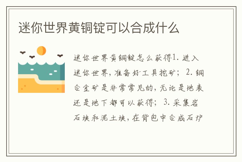 1.進(jìn)入迷你世界,準(zhǔn)備好工具挖礦;2.銅合金礦是非常常見的,無論是地表還是地下都可以獲得;3.采集巖石塊和泥土塊,在背包中合成石爐;4.將制作完畢的石爐放置地面上,鼠標(biāo)右擊使用?!就卣箖?nèi)容】《迷你世界》是一款高度自由的。