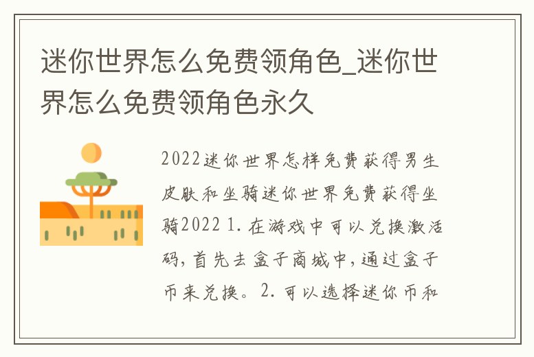 迷你世界怎么免費領角色_迷你世界怎么免費領角色永久