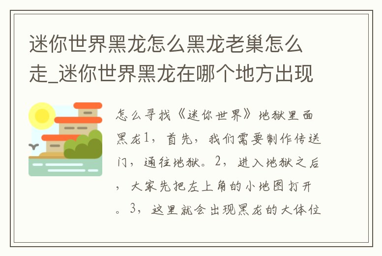 1,首先,我們需要制作傳送門(mén),通往地獄。2,進(jìn)入地獄之后,大家先把左上角的小地圖打開(kāi)。3,這里就會(huì)出現(xiàn)黑龍的大體位置了,大家朝這個(gè)龍頭的方向走就可以找到黑龍了。4,這個(gè)只是一個(gè)方向,所以大家在走的時(shí)候,務(wù)必繞開(kāi)一。