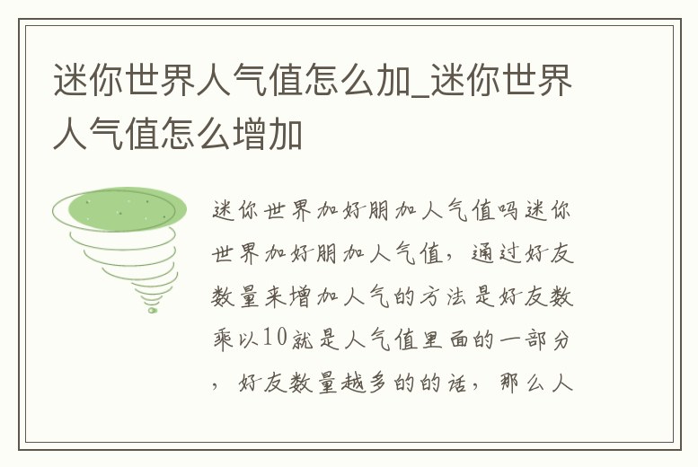 迷你世界加好朋加人氣值嗎迷你世界加好朋加人氣值,通過好友數(shù)量來增加人氣的方法是好友數(shù)乘以10就是人氣值里面的一部分,好友數(shù)量越多的的話,那么人氣值加成就會越多。《迷你世界》是一款高度自由的休閑類3D沙盒游戲,由