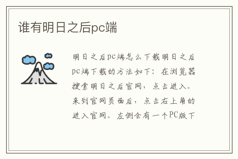 《明日之后》pc端因為效果不太好。被從官網去除掉了。通過官網可以看到pc端目前只有模擬器,在明日之后更新第四季時官網下架了pc版,具體上線時間不詳。已經下載了pc版的玩家不影響使用。不過使用模擬器和pc端的其實也差不多。