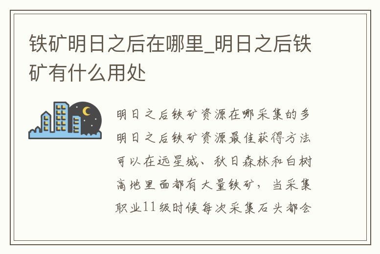 明日之后鐵礦資源最佳獲得方法可以在遠星城、秋日森林和白樹高地里面都有大量鐵礦,當采集職業11級時候每次采集石頭都會有礦石產出,采集等級太低的話很難出來鐵礦,建議平時多刷刷采集熟練度這樣可以最快升級。鐵礦資源哪里多其實。