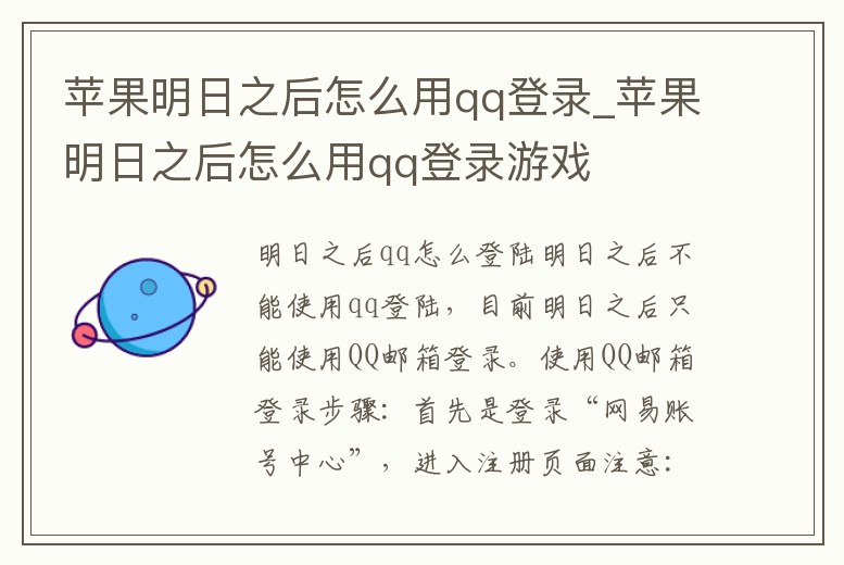 明日之后不能使用qq登陸,目前明日之后只能使用QQ郵箱登錄。使用QQ郵箱登錄步驟:首先是登錄“網易賬號中心”,進入注冊頁面注意:注冊頁面有兩種,選擇前者即可。進入注冊頁面后在賬號位置輸入申請時的qq郵箱,然后設置密碼。